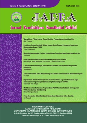 JAPRA (Jurnal Pendidikan Raudhatul Athfal) is a scientific journal which discussed about the results of the research, the development of scientific and development of innovative work that are relevant to the scope of Islamic Education of Early Childhood (PIAUD/PGRA). The journal is published by the Department of Islamic Education of Early Childhood UIN Sunan Gunung Djati Bandung and 4th rank accredited by SINTA.