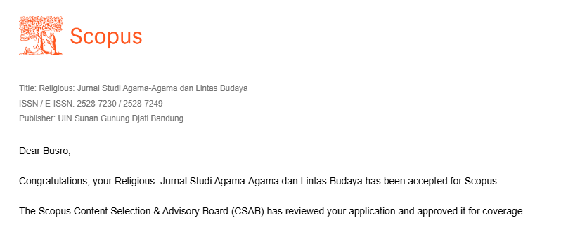 With great gratitude, we are pleased to announce that Religious: Jurnal Studi Agama-Agama dan Lintas Budaya has been officially accepted for Scopus coverage, based on the notification issued by the Scopus Title Evaluation Team.