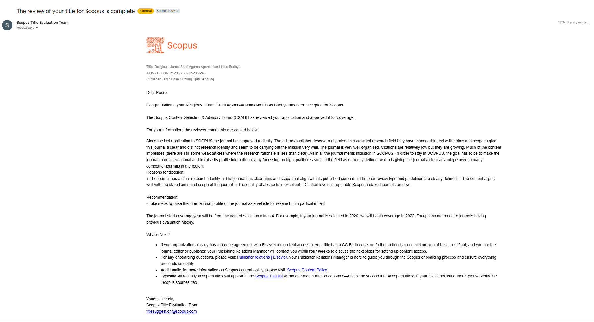With great gratitude, we are pleased to announce that Religious: Jurnal Studi Agama-Agama dan Lintas Budaya has been officially accepted for Scopus coverage, based on the notification issued by the Scopus Title Evaluation Team.