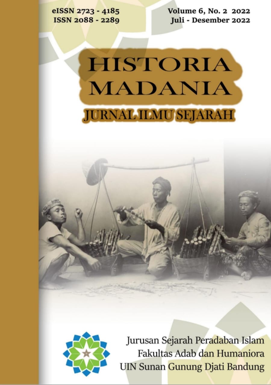 Vol. 2 No. 1 (2018)Historia Madania: Jurnal Ilmu Sejarah (ISSN: 2088-2289) adalah jurnal berkala ilmiah yang menerapkan proses peer-review. Pengelolaaan jurnal dilakukan oleh Prodi Sejarah Peradaban Islam Fakultas Adab dan Humaniora Universitas Islam Negeri Sunan Gunung Djati Bandung. Artikel yang dipublikasikan adalah artikel hasil penelitian dalam bahasa Indonesia, Inggris dan Arab yang berkaitan dengan peradaban, Budaya, dan Sosial Islam terkhusus sejarah Islam.