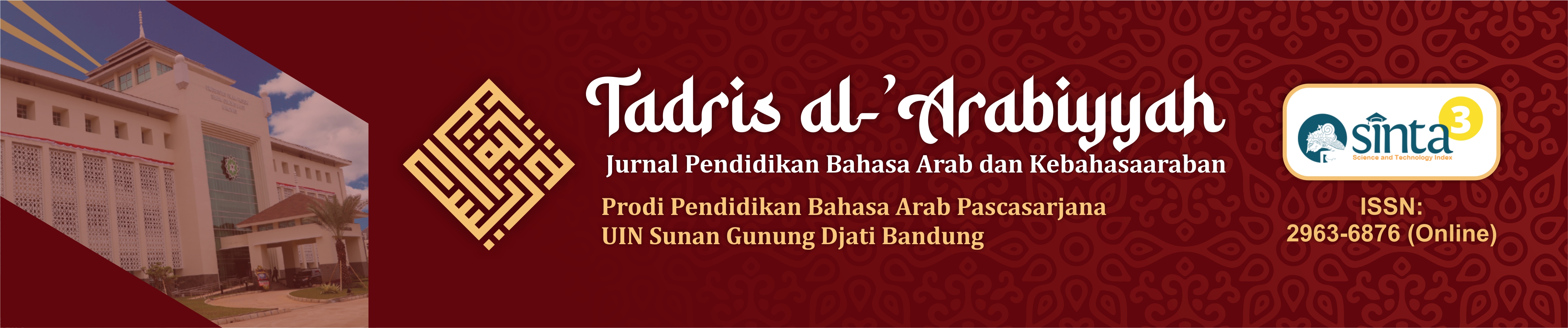 Tadris Al-'Arabiyyah: Jurnal Pendidikan Bahasa Arab dan Kebahasaaraban is a peer-reviewed journal on Arabic education field and intended to communicate original research and current issues on the subject. It is published twice a year since 2022 (April and October) in press version and open journal system in 2022. This journal is published by the Arabic Education Department, Pascasarjana Sunan Gunung Djati State Islamic University of Bandung, in partnership with IMLA (Ittihadul Mudarrisii al Lughah al 'Arabiyyah). Editors welcome scholars, researchers and practitioners of Arabic Education around the world to submit scholarly articles to be published through this journal. All articles will be reviewed by experts before accepted for publication. Each author is solely responsible for the content of published articles.